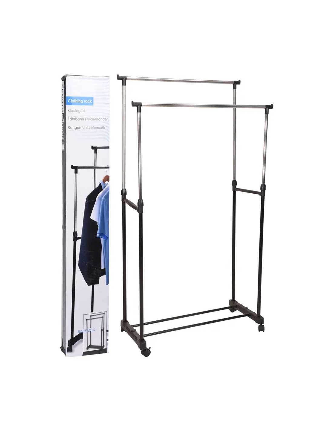 Un pratico appendiabito doppio 'Dubbel' nero, completo di ruote per facilitare il trasporto. Regolabile in altezza e con bracci laterali allungabili per massima versatilità.