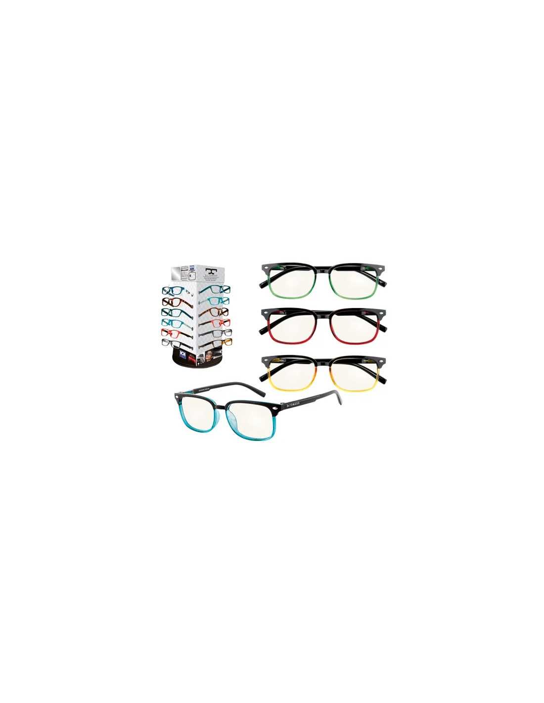 Assortimento di occhiali da lettura De Tomaso, ideali per proteggere gli occhi dai dannosi raggi blu emessi da PC, tablet e smartphone. L'assortimento include 24 pezzi in 4 colori diversi e 6 diottrie diverse, garantendo comfort e protezione per ogni esigenza visiva.