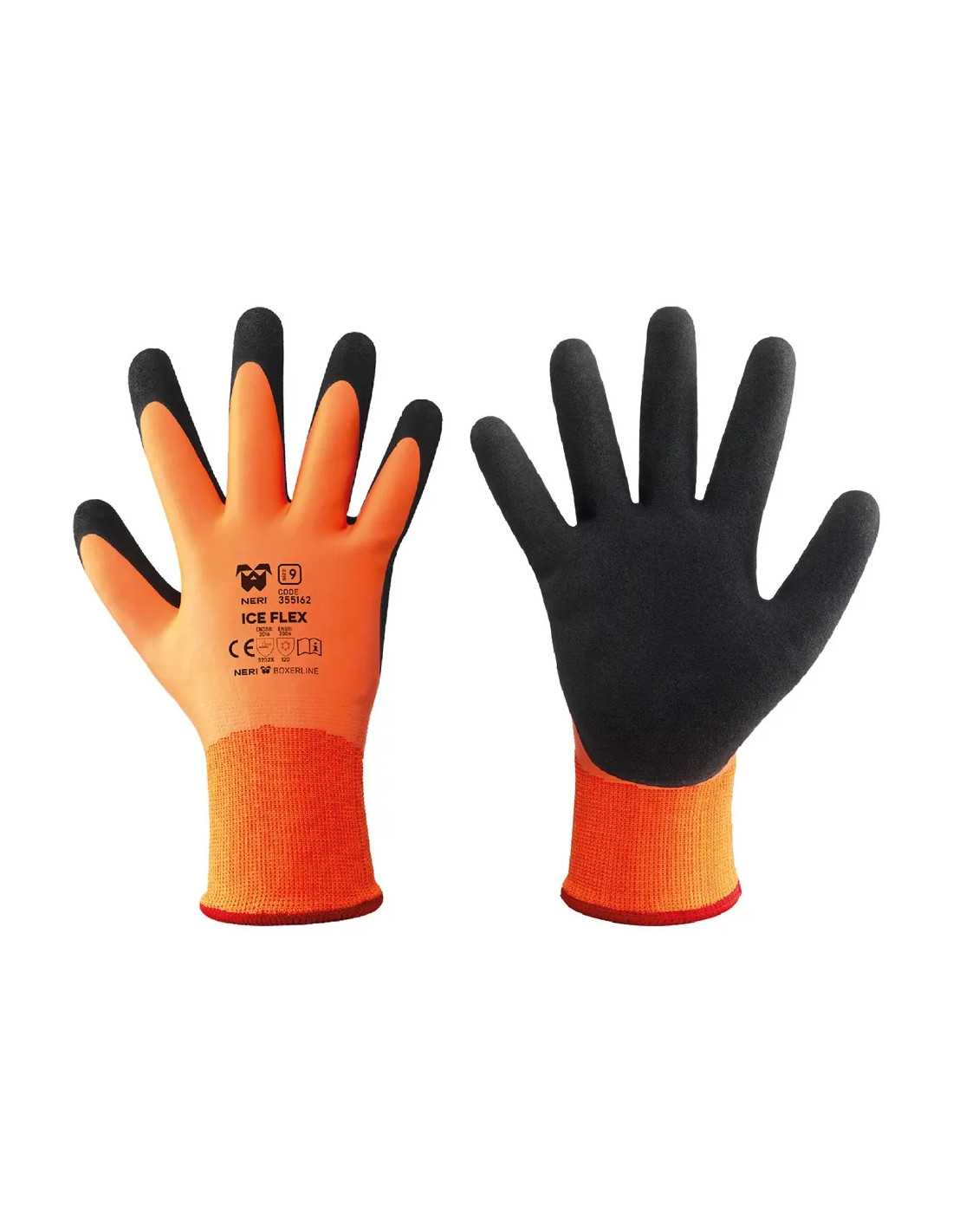 Guanti termici in poliestere/lattice 'Ice Flex' della NERI, taglia 8, ideali per proteggere le mani dal freddo durante attività di manutenzione, logistica e trasporti. Totalmente ricoperti in lattice con spalmatura sabbiata per una presa eccezionale. Conformi alle normative CE. Colore arancio/nero. In busta appendibile.