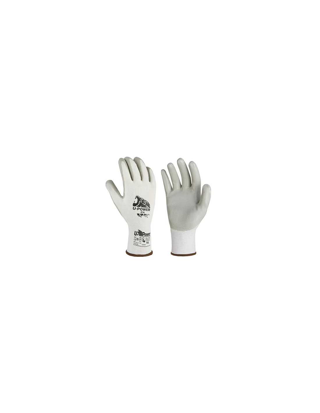 Guanti U-Power Fit, ideali per l'edilizia, magazzinaggio, servizi di pubblica utilità, settore automobilistico e fabbricazione metalli. Realizzati con fodera in nylon bianco e spandex, rivestimento in nitrile grigio chiaro per resistenza all'abrasione e protezione contro rischi meccanici e termici. Certificati secondo normative EN 407:2020, EN388 3121X.