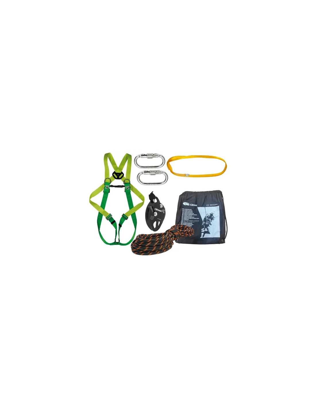 Kit Anticaduta Tetti Climax: un kit completo per la protezione anticaduta, con imbracatura, corda semistatica, dispositivo Roc, fettuccia di ancoraggio e moschettoni in acciaio. Ideale per lavori in quota e sicurezza sul tetto.