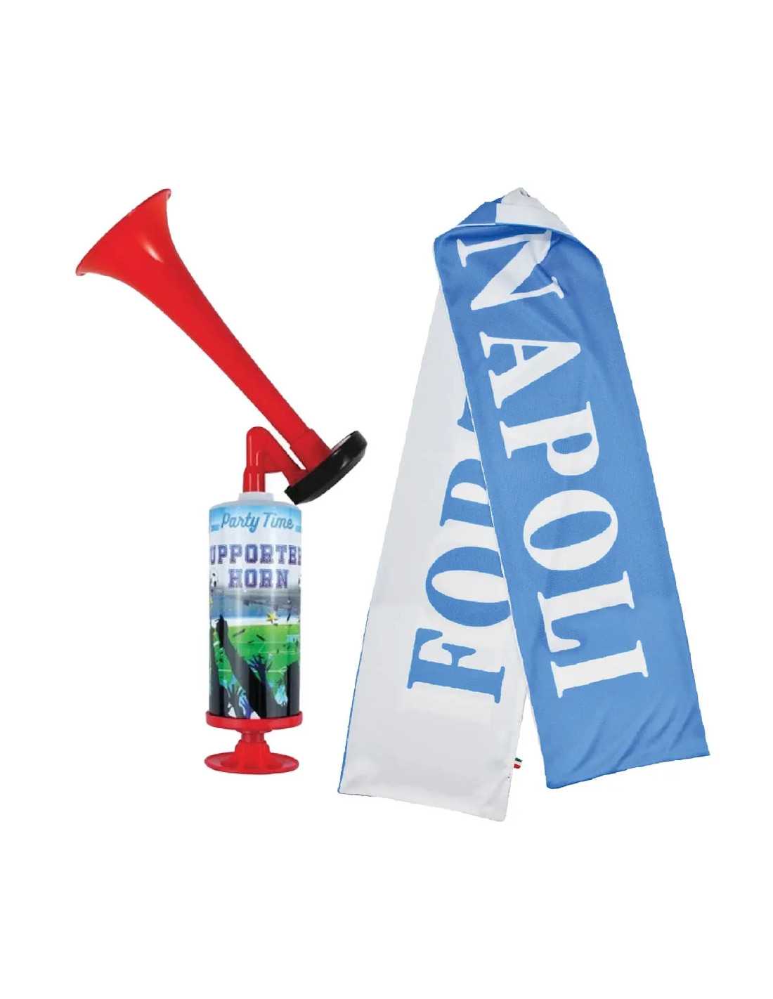 KIT DEL TIFOSO 'FORZA NAPOLI' è il set perfetto per mostrare il tuo sostegno alla squadra del cuore. Include una trombetta da stadio manuale 'Air Horn' e una sciarpa in tessuto 'Forza Napoli'.