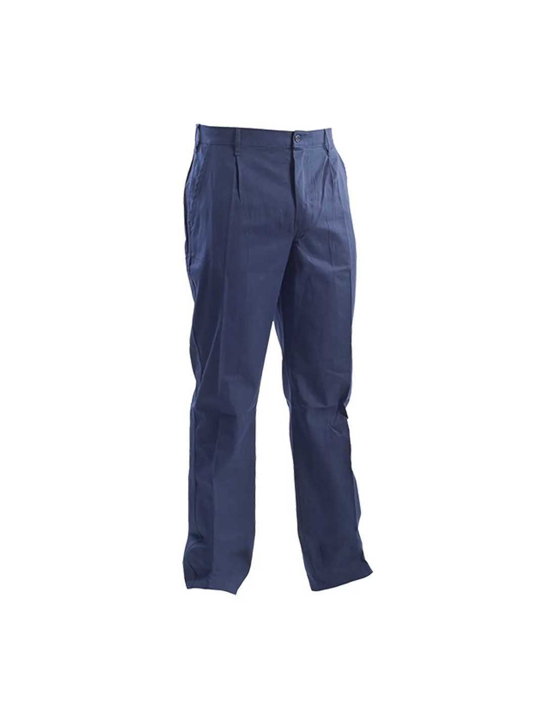Pantaloni da lavoro in cotone 100% drill massaua sanforizzato, colore blu. Con chiusura a patta con bottoni coperti, due tasche anteriori a filetto, una tasca posteriore con bottone, tasca porta metro e doppie cuciture nei punti di maggior sforzo.