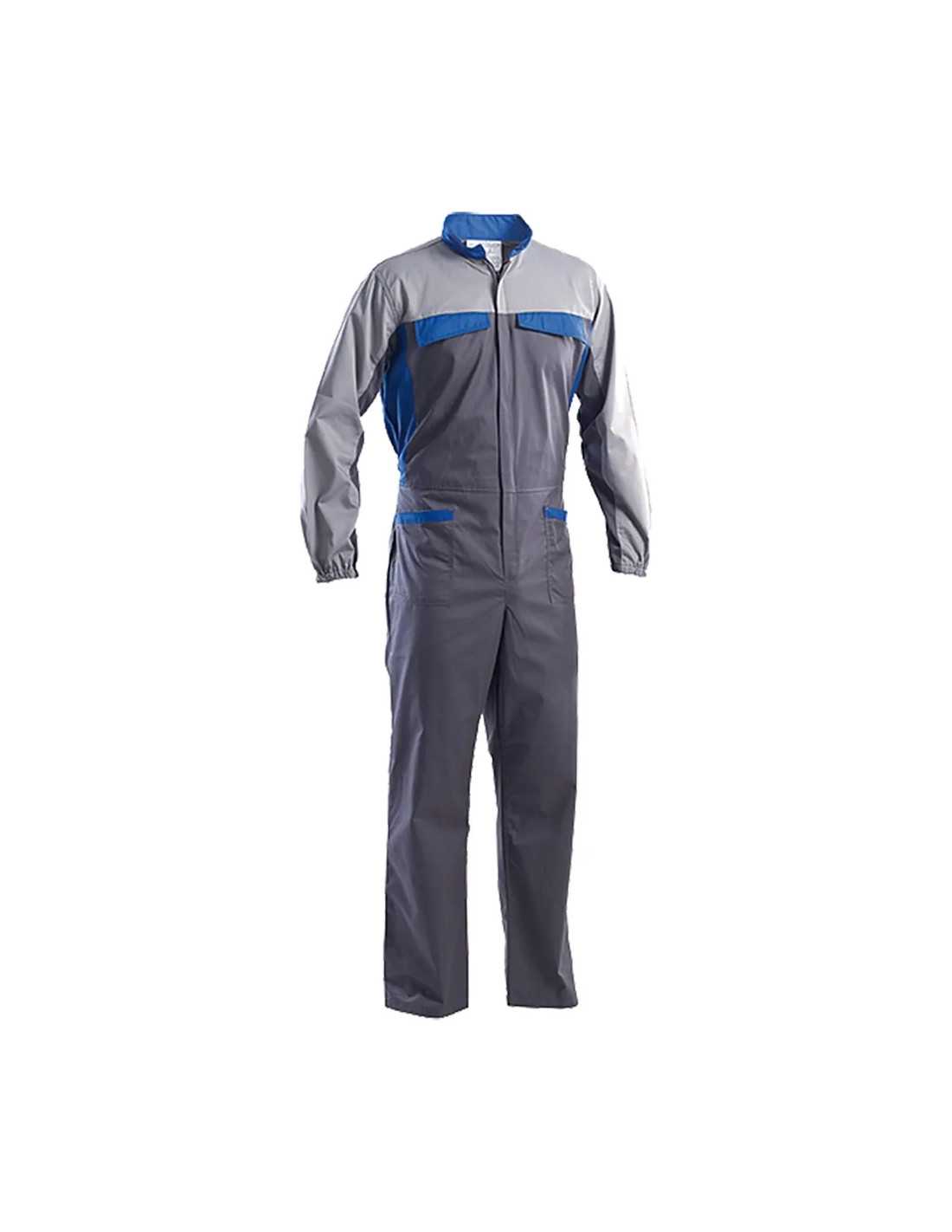 Tuta da lavoro in cotone twill e poliestere, peso 240 gr/mq. Collo alla coreana, polsini con elastico, chiusura anteriore con cerniera coperta a doppio cursore. Elastico posteriore in vita, taschini interni e anteriori. Doppie cuciture per maggiore resistenza. Colore grigio/blu.