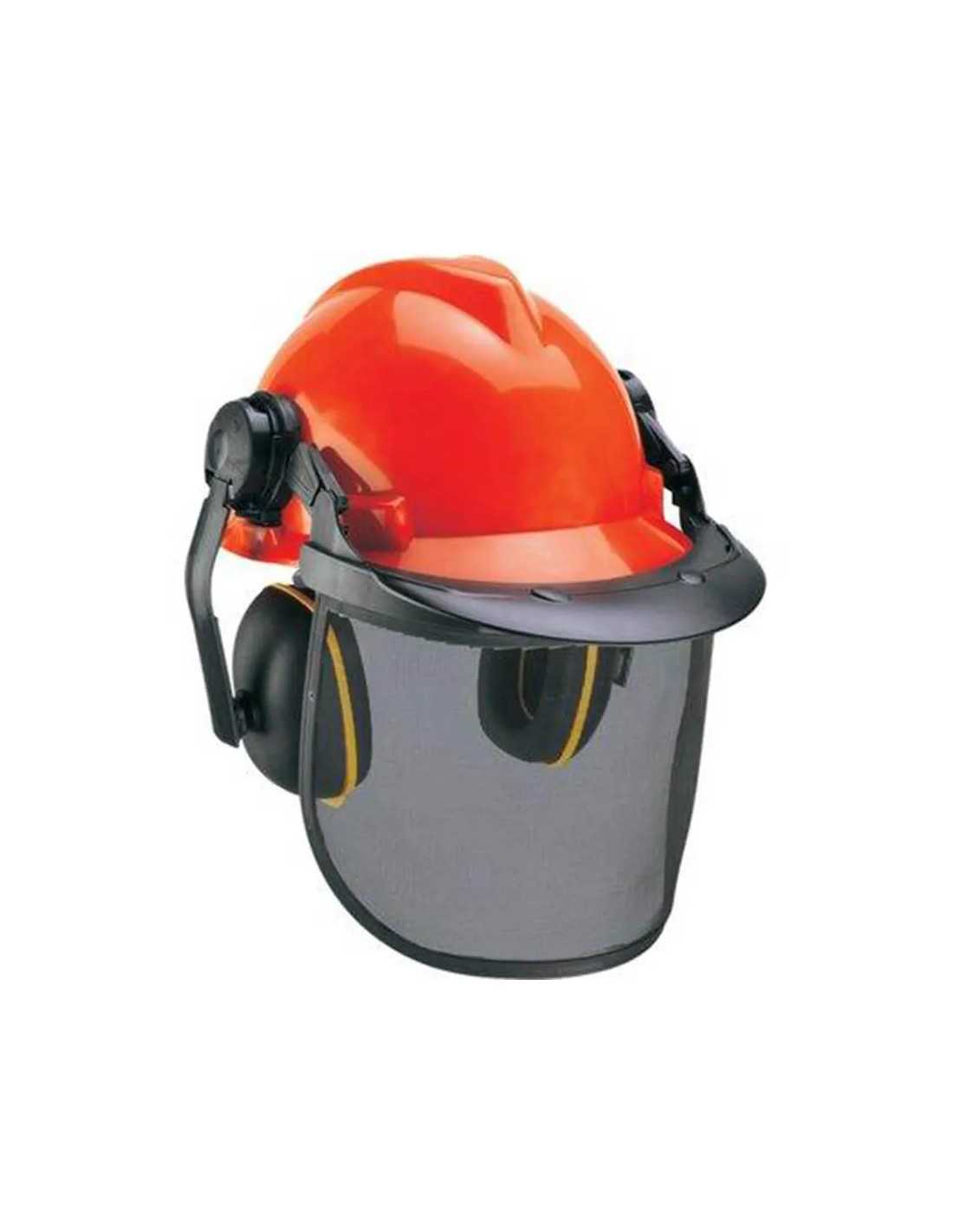 Visiera protettiva con rete metallica, elmetto e cuffia regolabile per una protezione completa durante il lavoro. La visiera è rimovibile e regolabile, le cuffie sono orientabili e regolabili in altezza per un comfort ottimale. Conforme alle normative di sicurezza europee.