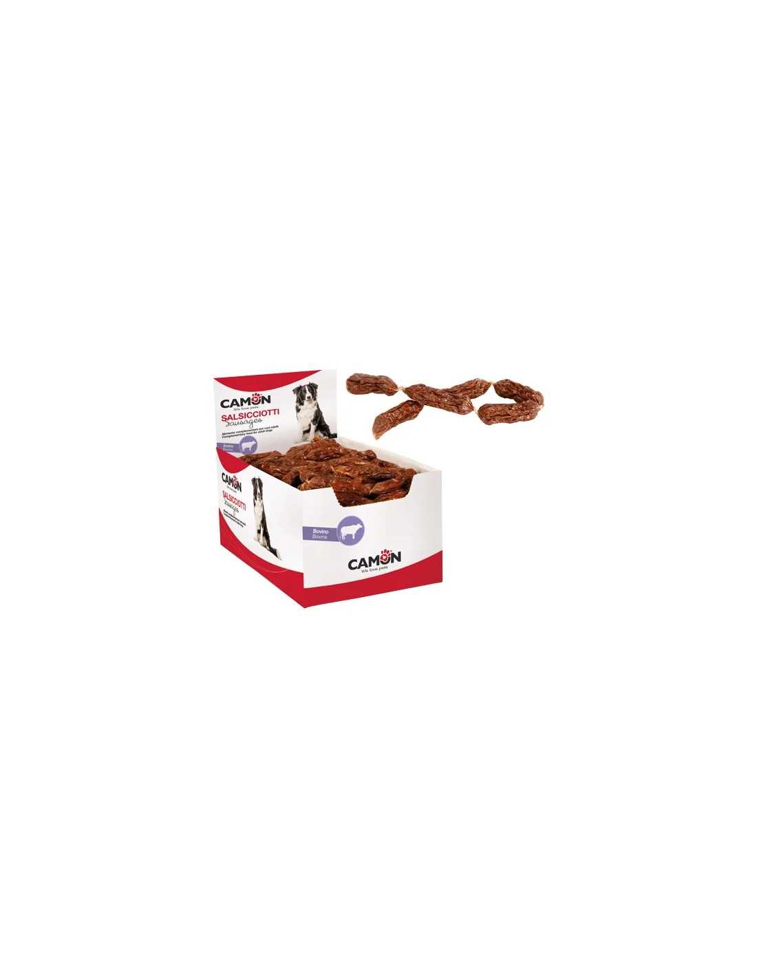 Salsicce manzo per cani Camon è un alimento ricompensa gluten free arricchito con vitamine, ideale come complemento della dieta quotidiana del tuo cane. Le salsicce hanno dimensioni comprese tra 6 e 8,5 cm e sono prive di coloranti artificiali.