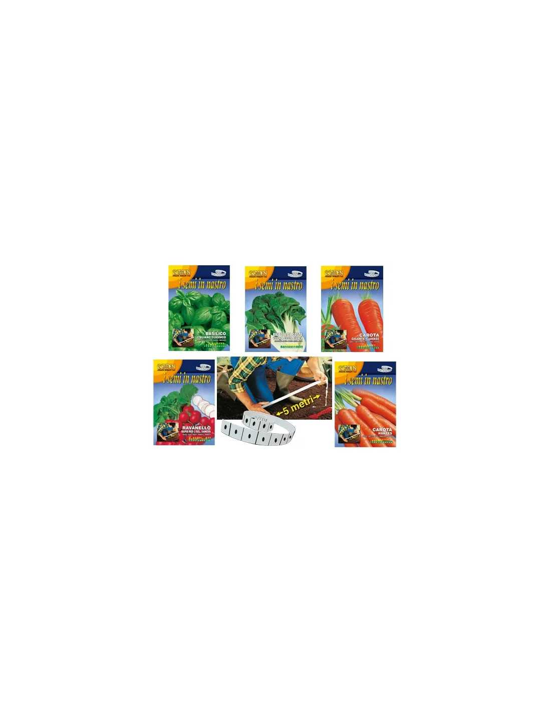 Sementi Franchi a nastro, comode e pratiche da utilizzare grazie al seme pre-spaziato inserito tra due veli di fibre vegetali di cellulosa che si sfaldano nel terreno. Questo permette un'interramento preciso a una profondità ottimale per la crescita delle piante, evitando la dispersione del seme grazie alla distanza già impostata sul nastro.