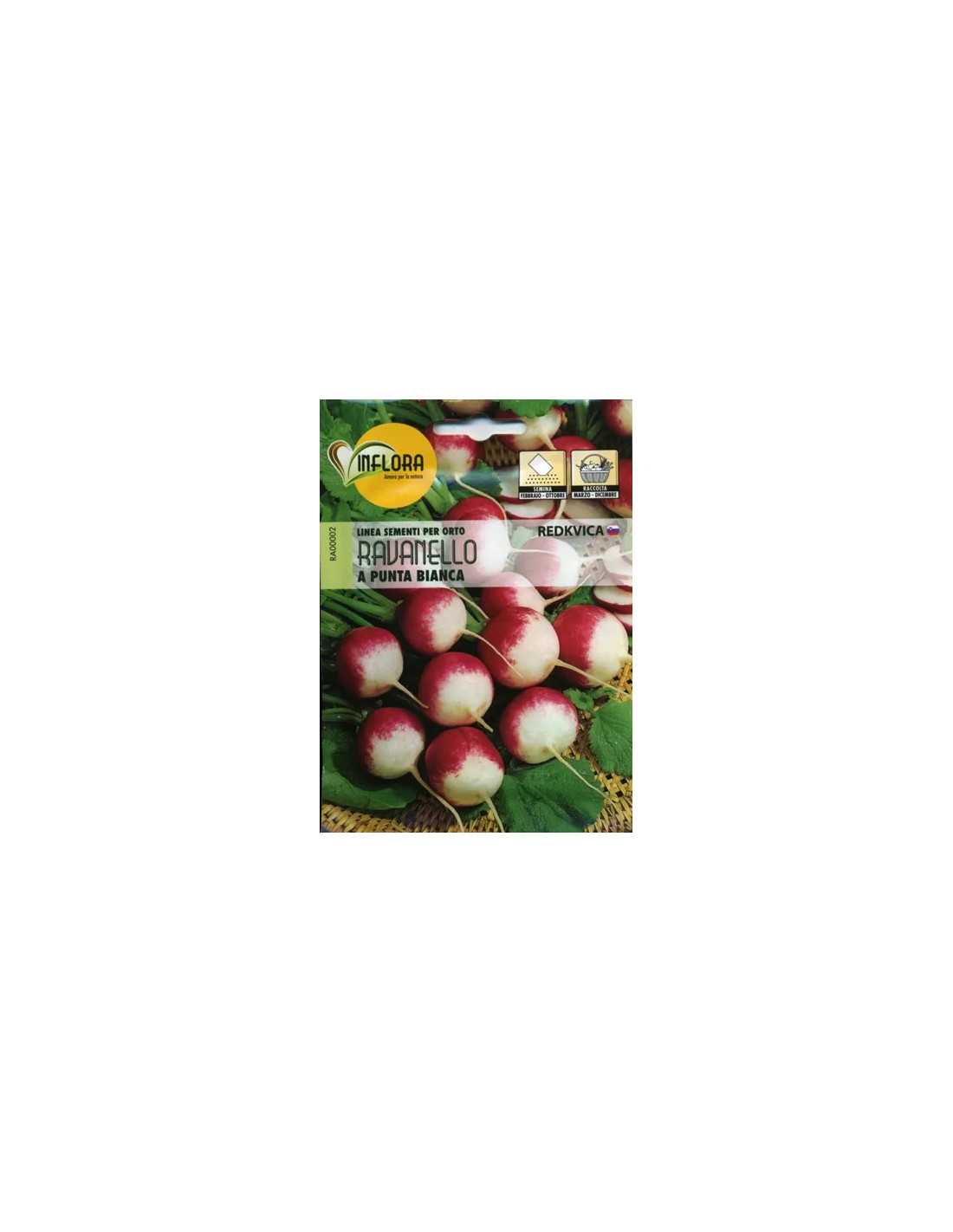 Sementi per orto ideali per coltivare deliziosi ravanelli a punta bianca. Confezione da 8 grammi.