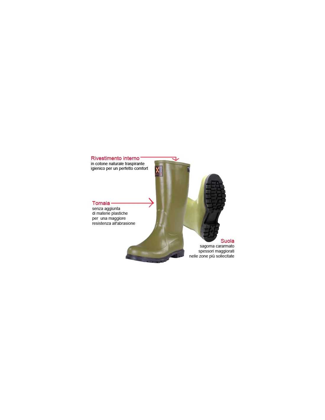 La tomaia in gomma, priva di aggiunta di materie plastiche, offre una maggiore resistenza all'abrasione, mentre il rivestimento interno in cotone naturale assicura traspirabilità e comfort per tutto il giorno. La suola sagomata con spessori maggiorati nelle zone più sollecitate garantisce una presa salda su qualsiasi terreno.