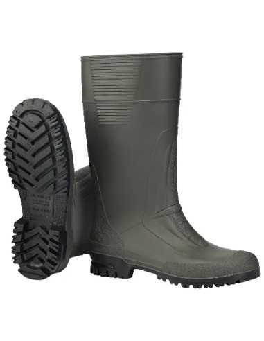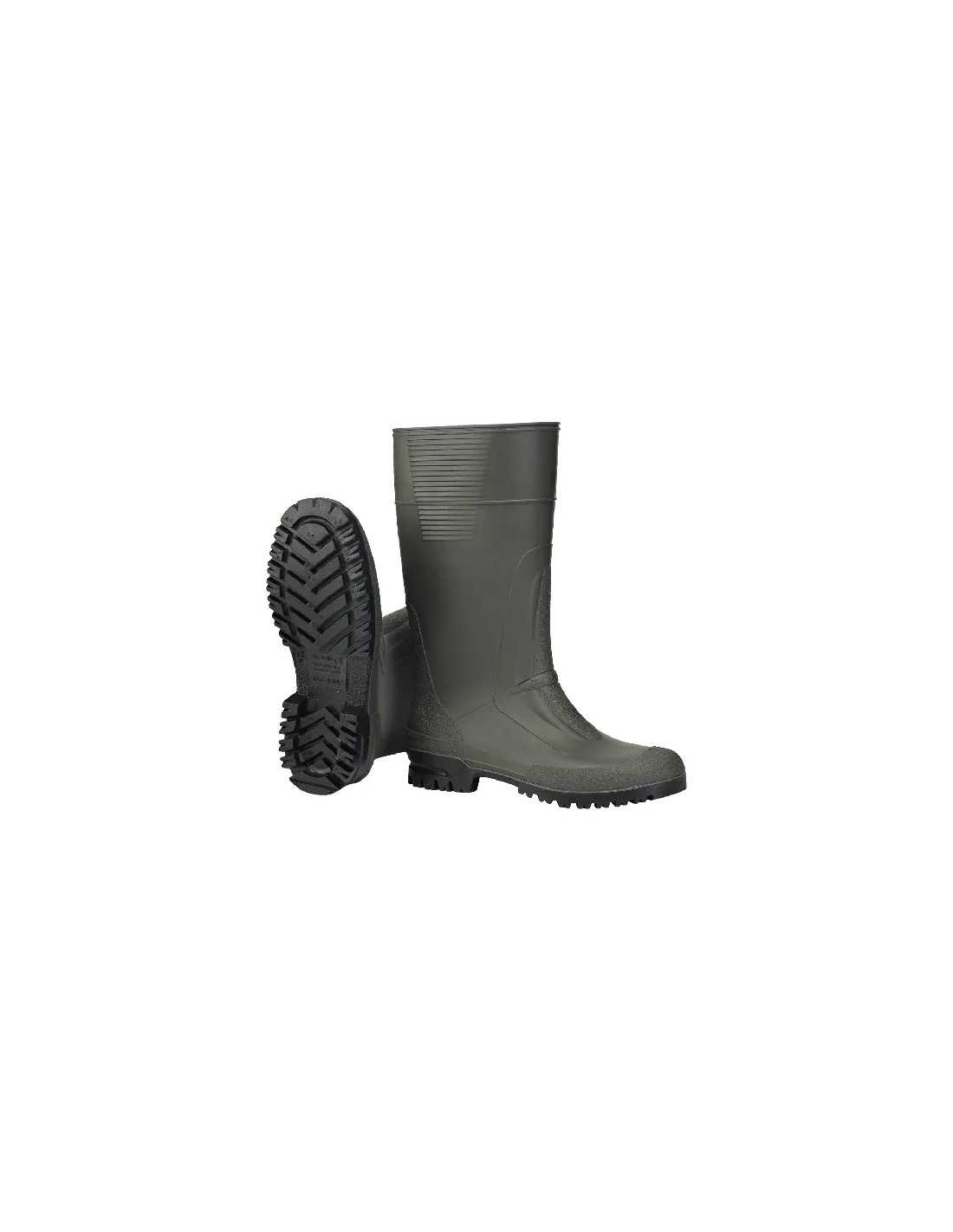Stivali in PVC di colore verde con suola carrarmato, conformi alla normativa EN ISO 20347:2012.