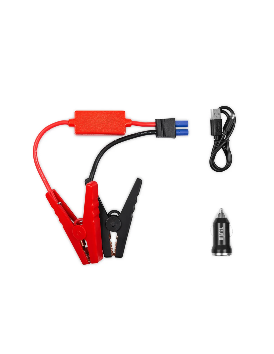 Accessori inclusi: cavo micro-USB, adattatore per presa accendisigari, pinze con protezione anti-inversione.
