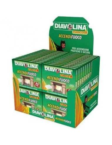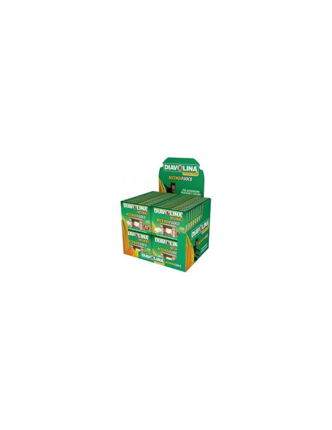 ACCENDIFUOCO DIAVOLINA FUOCO MINI EXPO è un espositore in cartone su mini pallet che contiene 48 confezioni di 40 cubetti ciascuna, ideale per accendere il fuoco in modo rapido e sicuro.