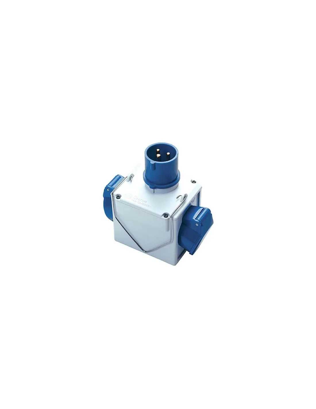 Un pratico adattatore doppio con spina e presa blu, ideale per collegare due dispositivi contemporaneamente. Conforme allo standard IP44, da spina 2P+T 16A 220V CEE blu a 2 prese 2P+T 16A 220V CEE blu.