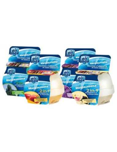 AIRMAX SALI KIT DEO è un kit usa e getta da Gr. 40 che offre un'efficacia 2 in 1: deumidifica e profuma i piccoli ambienti come armadi, cassetti, ripostigli e scarpiere. Disponibile in quattro diverse fragranze: Lavanda, Freschezza Alpina, Pesca Mango e Vaniglia.
