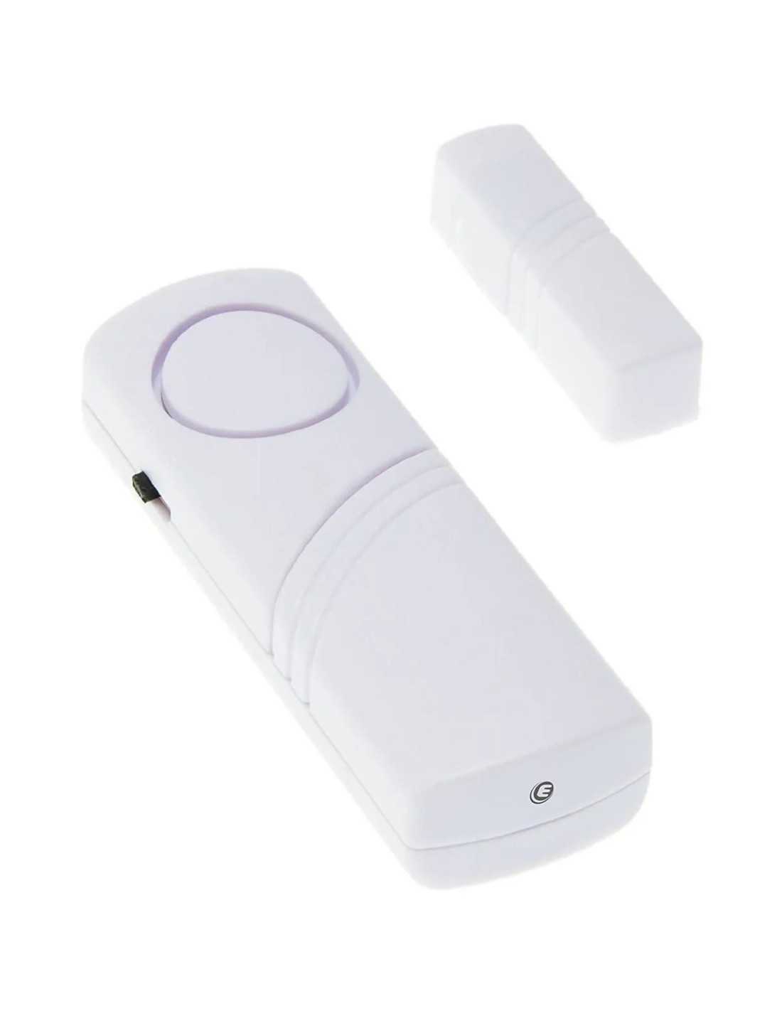 Allarme magnetico per porte e finestre, ideale per proteggere la tua casa o ufficio. Alimentato a batteria, con selettore ON/OFF per una facile gestione. Design compatto e discreto in colore bianco.