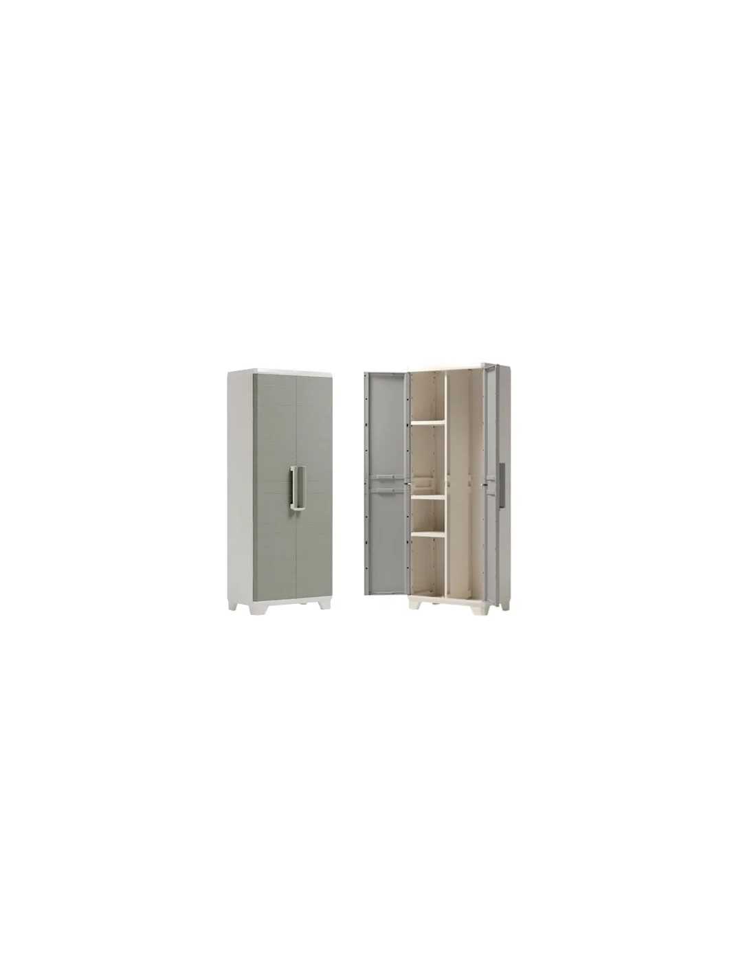 Le 2 ante con finitura effetto legno conferiscono all'armadio un aspetto moderno e raffinato, perfettamente adattabile a qualsiasi ambiente esterno. Il vano portattrezzi e i 3 ripiani regolabili offrono ampia capacità di stivaggio, mentre i piedini regolabili garantiscono stabilità su qualsiasi superficie.