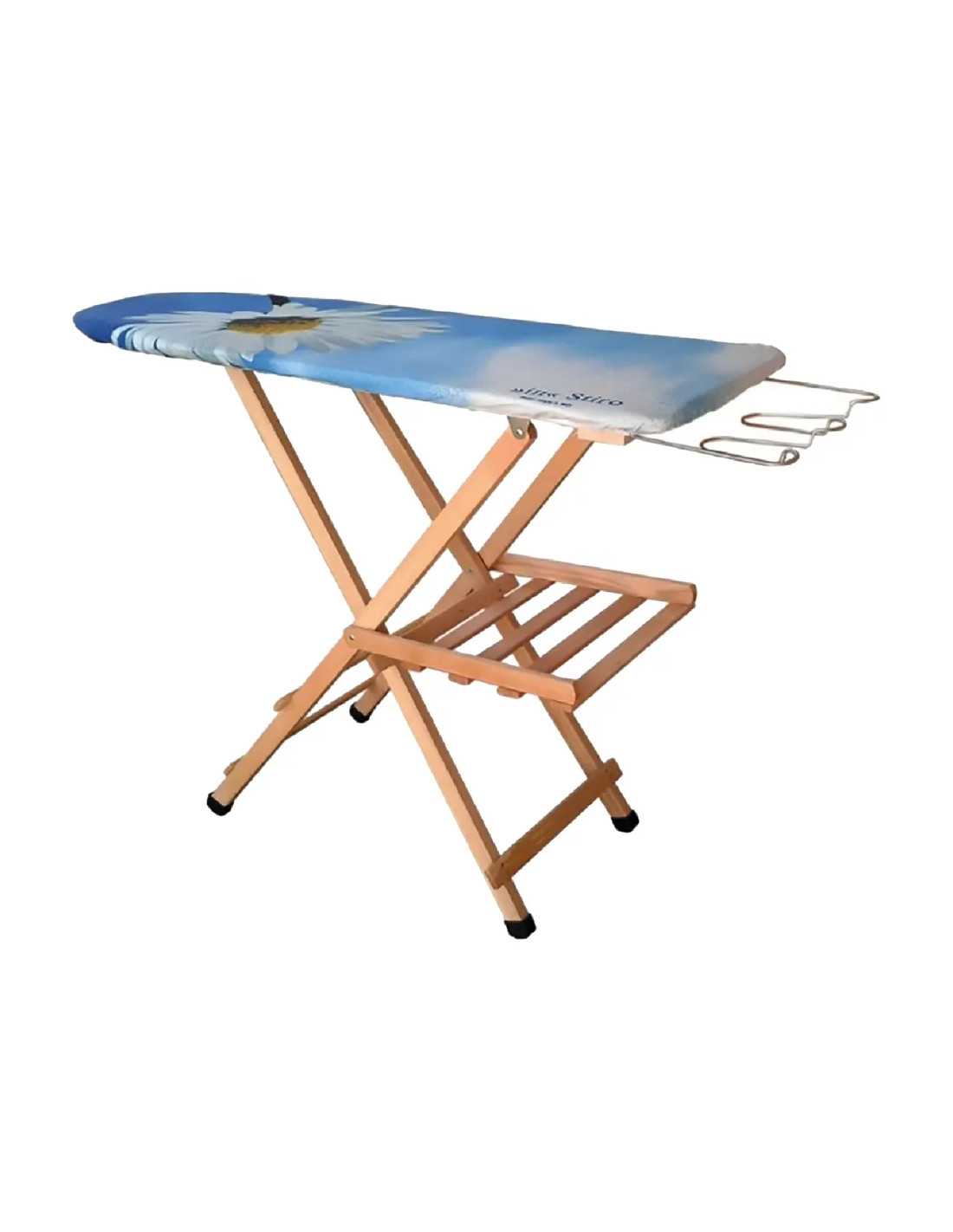 Asse da stiro in legno con telaio in faggio e piano in legno massello. Dotato di poggiaferro in ferro e foderina in cotone con imbottitura. Altezza regolabile a 3 posizioni per massimo comfort durante l'uso.