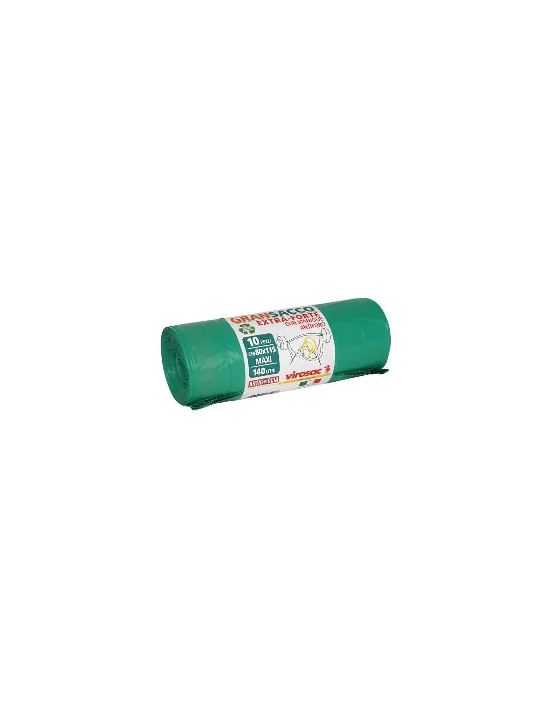 Le buste Gransacco sono realizzate in polietilene a bassa densità (LDPE), un materiale resistente e antigoccia, ideale per contenere rifiuti di vario genere. Queste buste, con dimensioni di 80x115 cm e una capacità di 140 litri ciascuna, sono dotate di maniglie estraibili per facilitare il trasporto e lo smaltimento dei rifiuti.