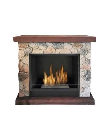 Camini a Bioetanolo Sasso con struttura in polyform effetto pietra e legno, inserto in acciaio e bruciatore certificato. Combustibile bioetanolo per un'atmosfera calda e accogliente.