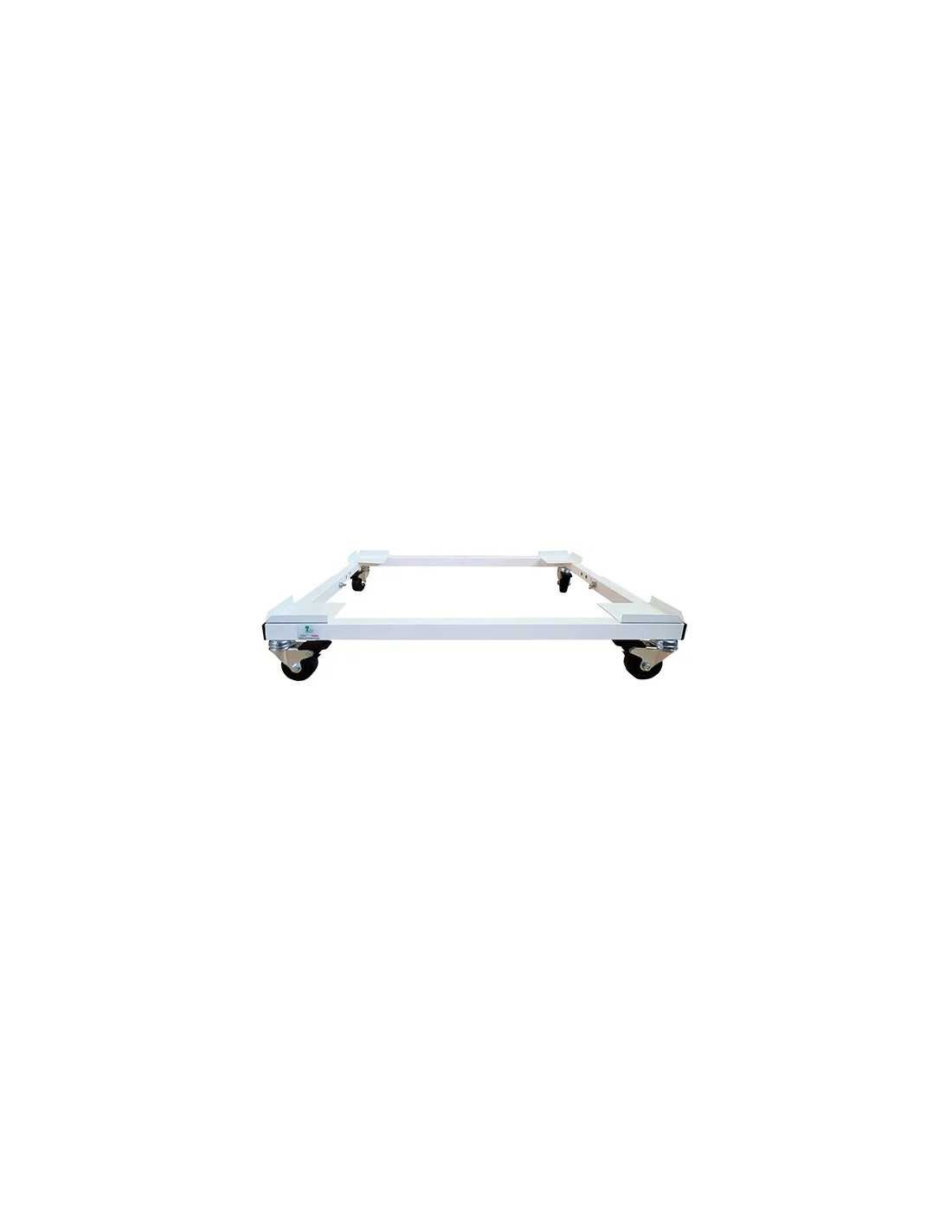 Carrello lavatrice regolabile con ruote in acciaio verniciato bianco è realizzato totalmente in acciaio, con ampi angoli per il contenimento e adatto a tutti i tipi di lavatrici. Dotato di feltrini antiscivolo e 4 ruote industriali con freno da ø50 mm.