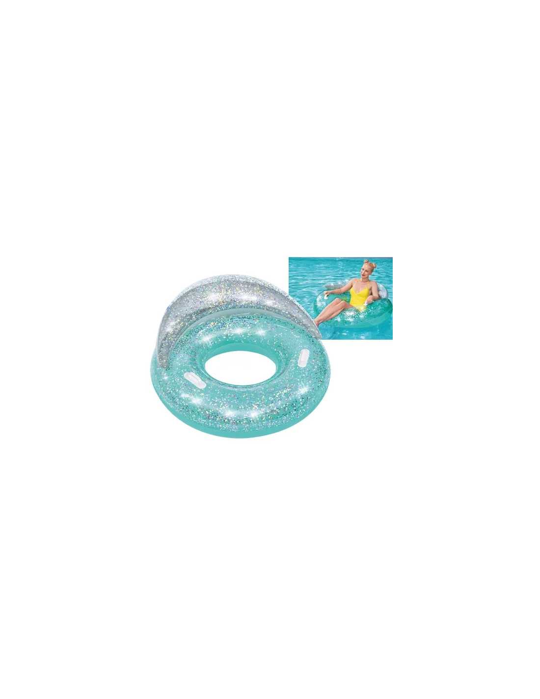 Anello gonfiabile PVC con finitura glitter, poggiatesta e maniglie resistenti. Ideale per rilassarsi in piscina o al mare.
