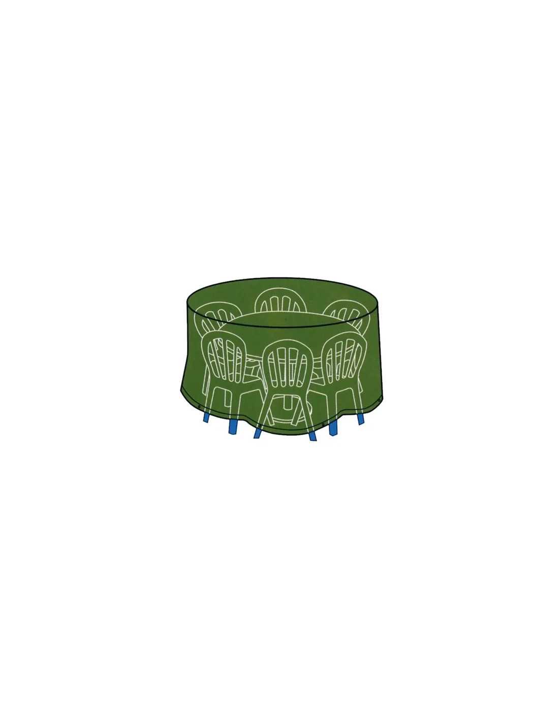 Teli Cover per tavolo tondo con sedie in PVC colore verde, con chiusura ad elastico per una maggiore protezione.