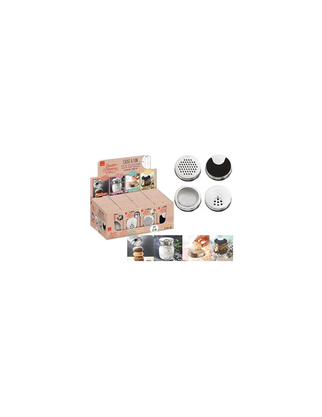 Espositore Tappi Genietti Quattro Stagioni Bormioli, ideale per personalizzare i vostri vasetti di vetro da cucina. Contiene 4 referenze di tappi originali e funzionali: Tappo grattugia, Tappo lavagna, Tappo sale e spezie, Tappo setaccio. Scopri come trasformare i tuoi vasetti in oggetti unici e utili!