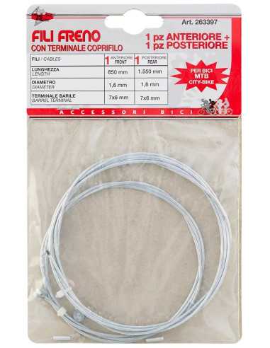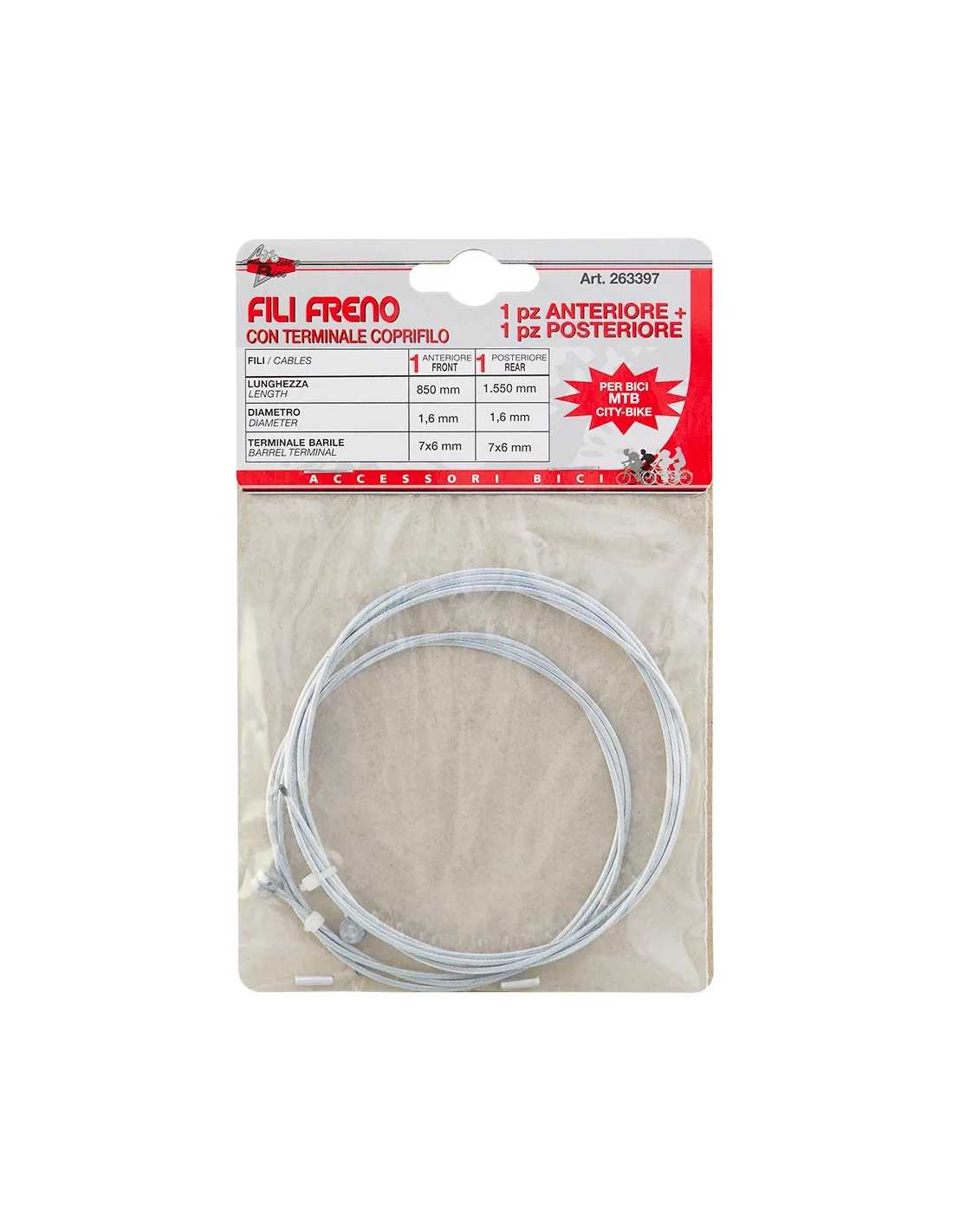 Filo freno per MTB e CITY BIKE, ideale per un perfetto controllo della frenata. Il kit include un filo anteriore lungo 85 cm e uno posteriore lungo 155 cm, entrambi con diametro di 1,6 mm. Dotato di terminali a barile per un'installazione semplice e sicura.