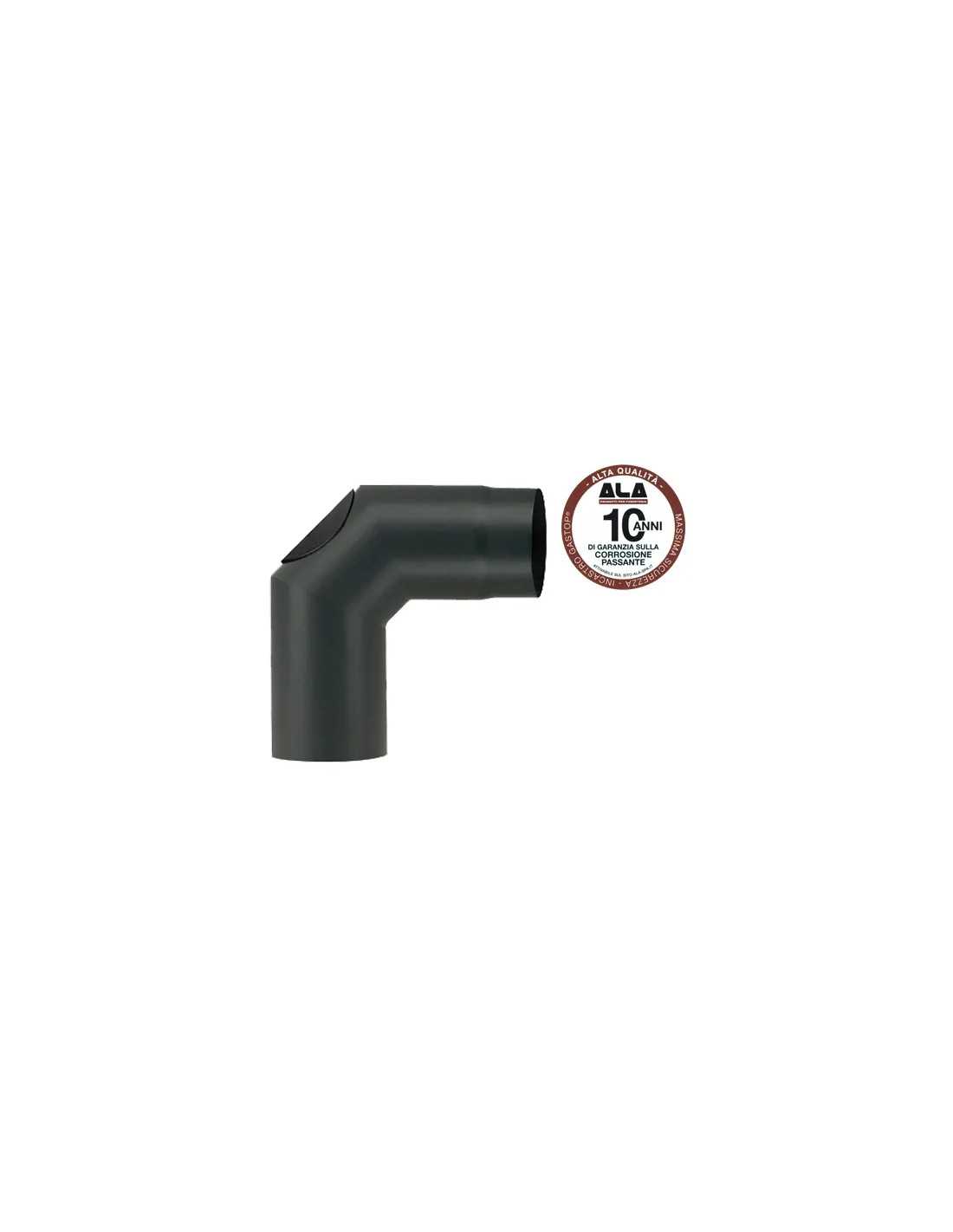 Gomiti a 90° con ispezione Ala Smalto Top, ideali per stufe. Realizzati in acciaio pesante ad alto spessore, saldati con tecnologia laser e rivestiti con smalto porcellanato sia all'interno che all'esterno. Finitura nero opaco, con portello d'ispezione per una facile manutenzione. Certificati CE secondo le norme EN 1856-2 e EN 1443, garantiscono resistenza alla temperatura e alla corrosione.