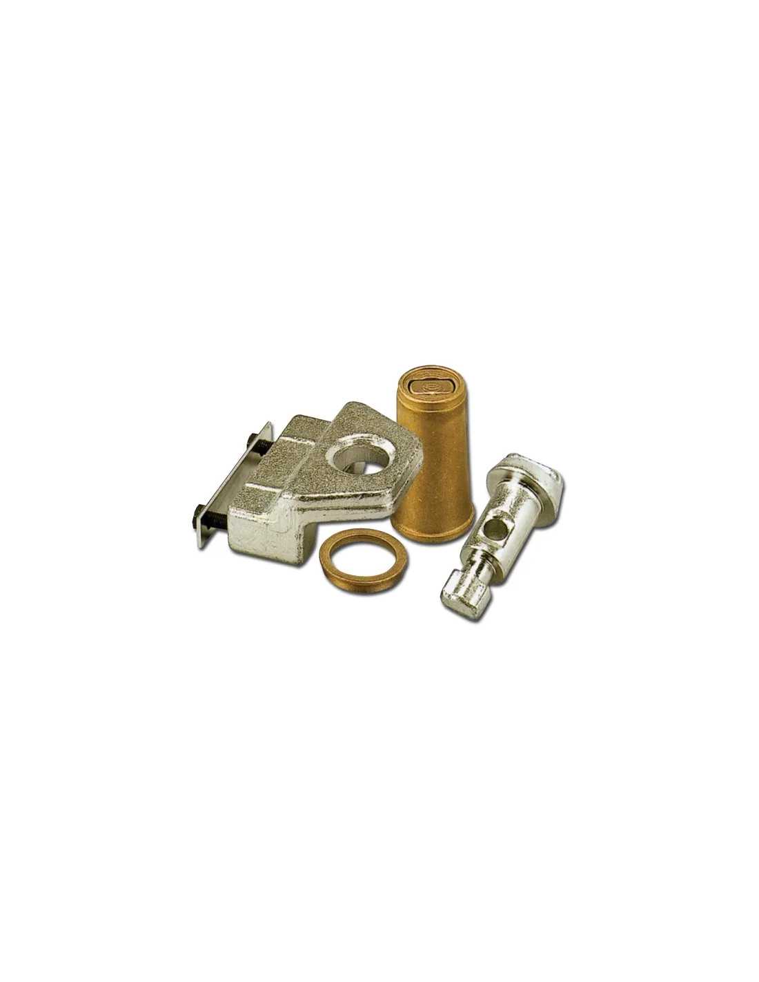 GRUPPO FISS. LUCCHETTO SERRANDA è un insieme di componenti di alta qualità per la chiusura sicura di serrande e cancelli. Include un perno in acciaio zincato, un pozzetto in ottone fuso con tappo a molla e un blocco di chiusura a sbalzo in acciaio zincato.