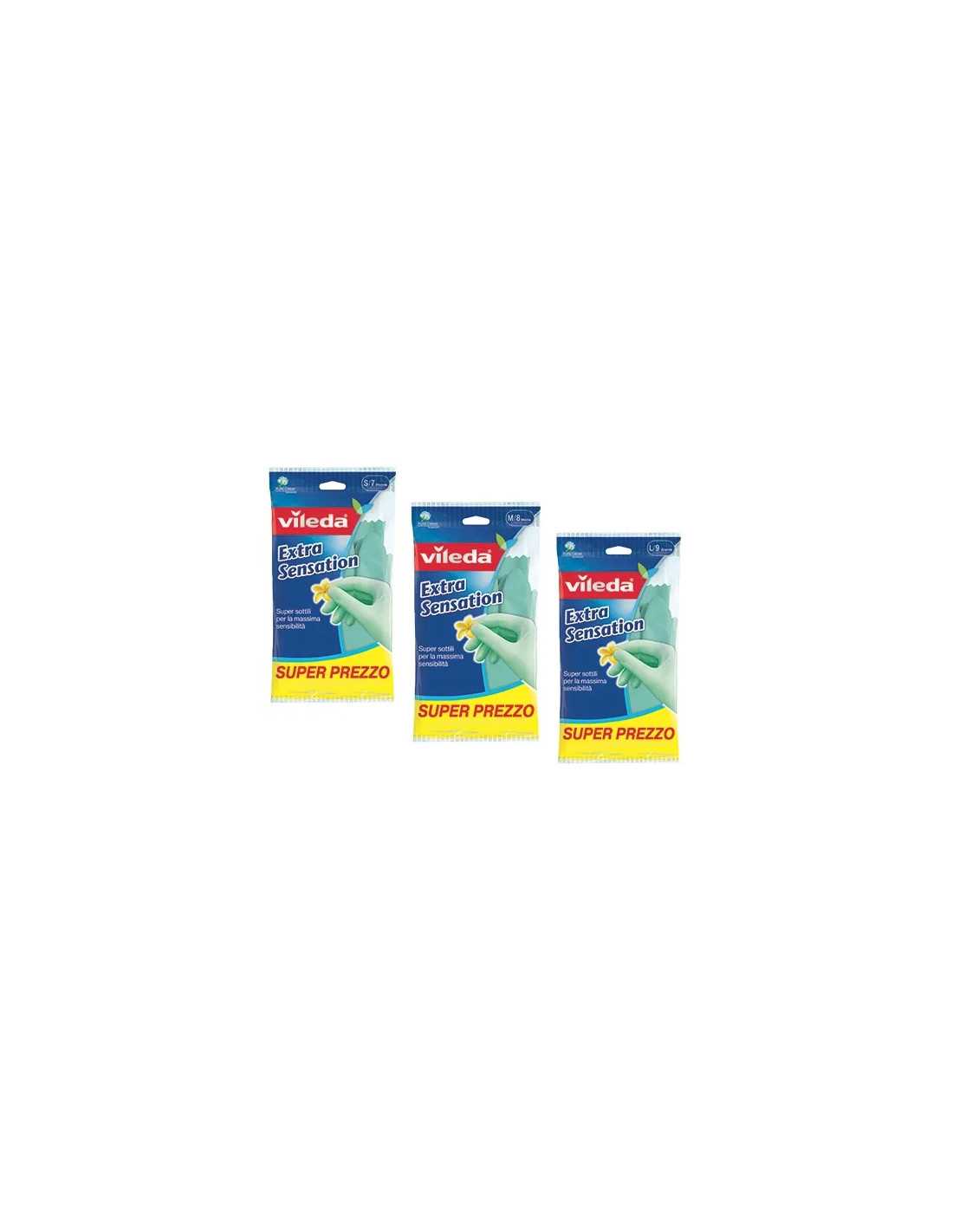 Guanti Vileda Extra Sensibile: guanti in lattice naturale estremamente sottili, con interno felpato in cotone per una sensazione di comfort e sensibilità al tatto.
