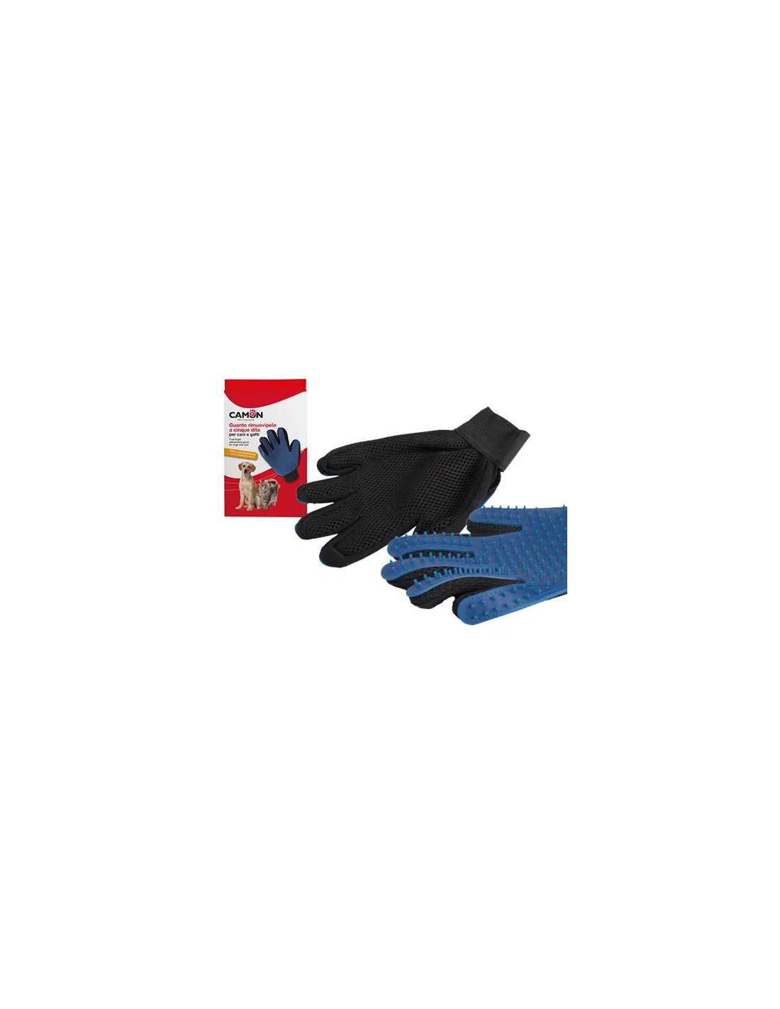 Guanto Rimuovipeli per cani e gatti Camon, con forma a 5 dita che riproduce il tocco della mano. Le punte in morbido TPR catturano il pelo in profondità, riducendo lo spargimento dei peli. Ideale per cani e gatti a pelo corto, con un'azione traspirante per una pulizia efficace.