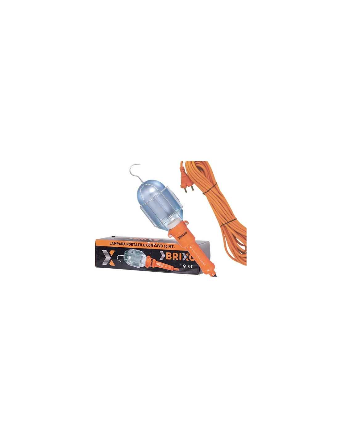 Lampade portatili Brixo con cavo, dotate di gancio e protezione in metallo zincato. Ideali per illuminare qualsiasi ambiente in modo pratico e sicuro, grazie ai 10 mt. di cavo e alla presa schuko inclusa. Lampadina max 60W per una luminosità ottimale.