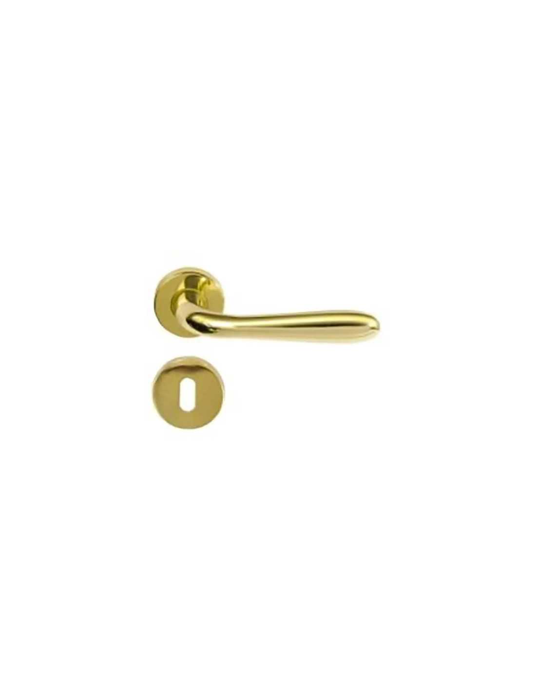 MANIGLIA IN ALLUMINIO 'AGNONE' è un elegante e resistente maniglia in alluminio con finitura oro e rosetta di dimensioni Ø 45 mm. Ideale per aggiungere un tocco di classe e stile a qualsiasi porta.
