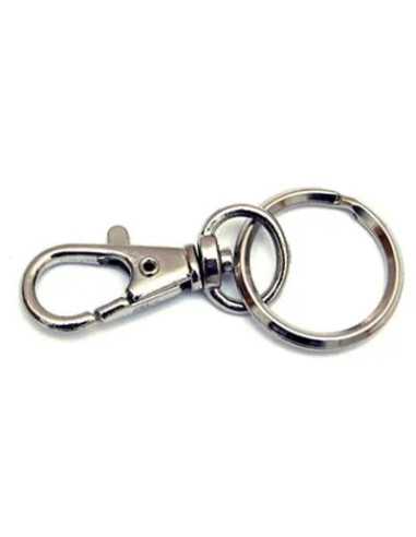 Moschettone portachiave mini in zama nichelata, con givolare e anello. Ideale per tenere sempre a portata di mano le tue chiavi in modo sicuro e pratico.