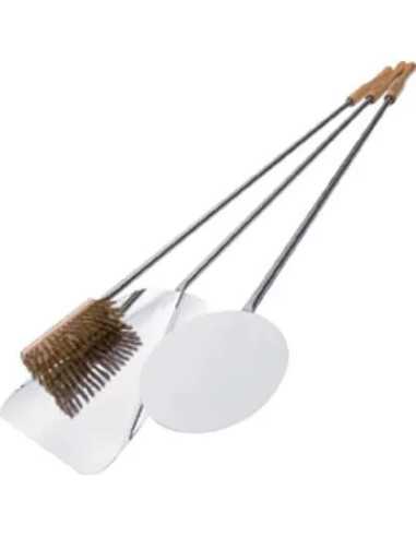 Kit completo per cuocere pizze da 30 cm di diametro, comprensivo di pala rettangolare per infornare, palino rotondo per girare e spazzola con setole in ottone. Ideale per preparare pizze croccanti e gustose in poco tempo!