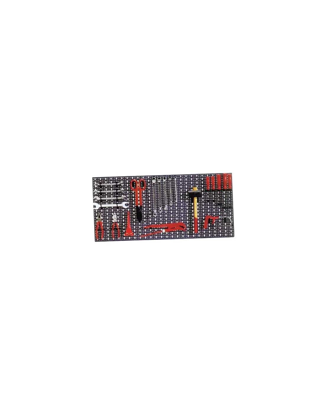 Kit di pannelli forati in lamiera verniciata a caldo, ideali per l'organizzazione degli utensili. Il set include 52 ganci diversi per il posizionamento degli attrezzi in modo ordinato e pratico.