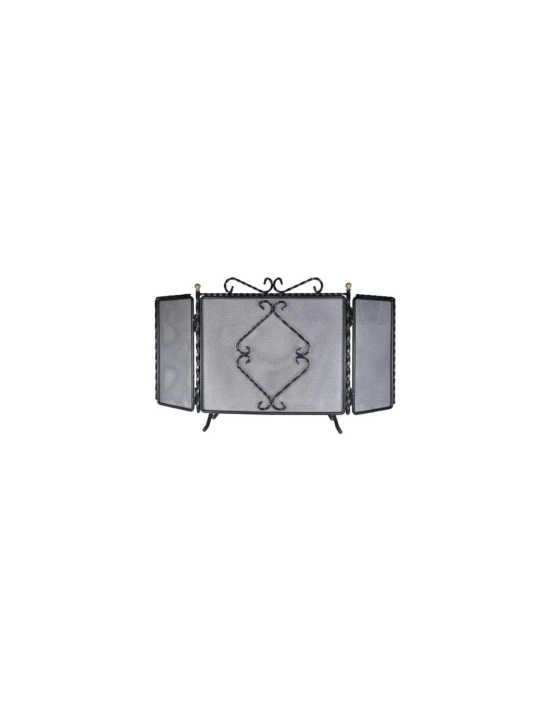 Il PARASCINTILLE FERRO BATTUTO TRECCIA 3 ANTE è un elegante e robusto separè realizzato in ferro tondo verniciato nero, impreziosito da decori in ferro battuto a rilievo e pomelli in ottone.