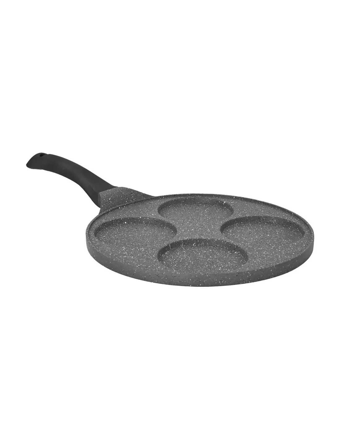 PIASTRA PER PANCAKE di diametro 26 cm, con 4 fori da 10 cm. Realizzata in alluminio pressofuso con rivestimento esterno siliconico HT petravera 3.0 e interno petravera 3.0 rinforzato con minerali. Manico in bakelite. Adatta a tutti i piani di cottura, inclusa l'induzione.