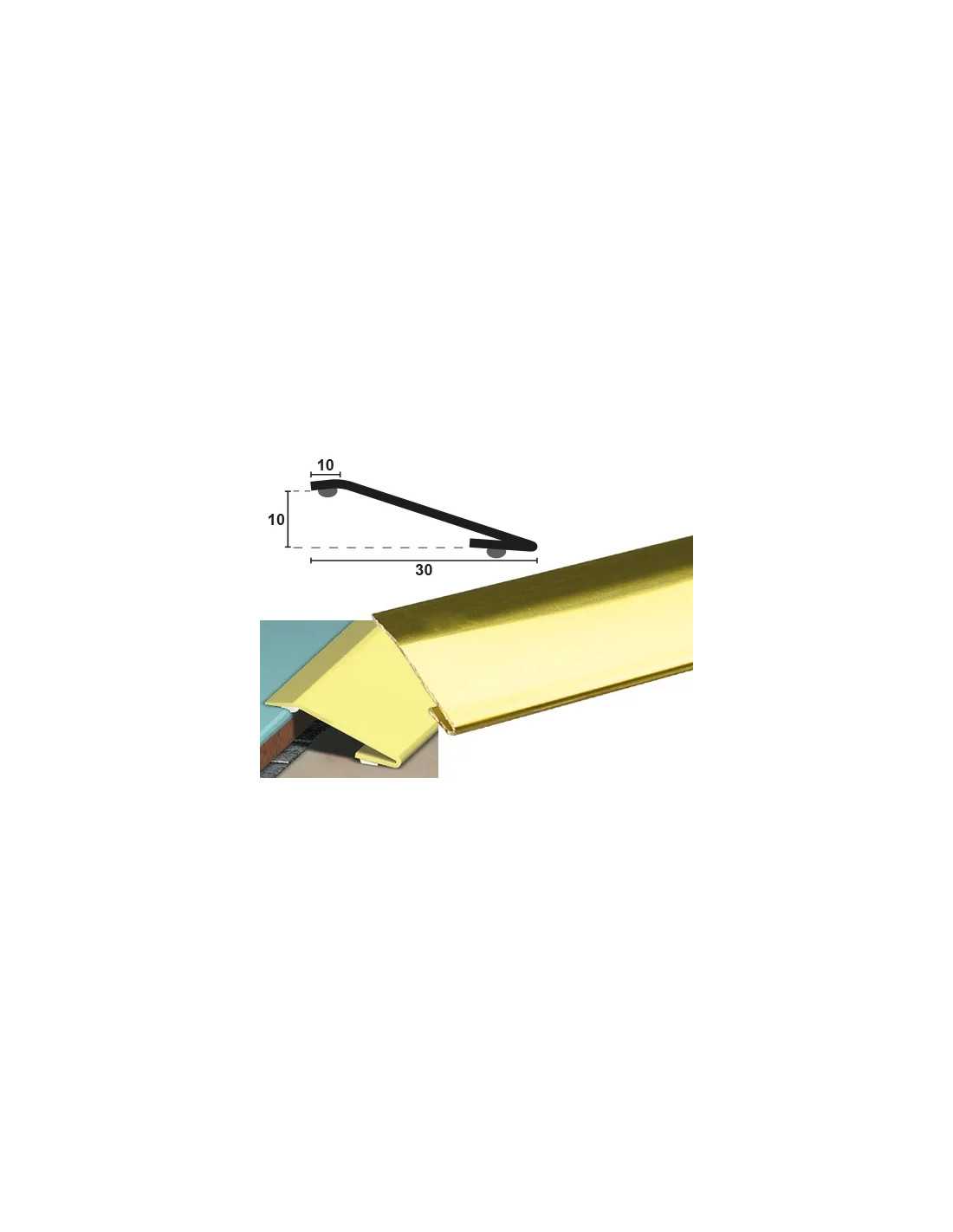 Terminali Proterm Scivolo 007A sono profili in ottone con finitura lucida, ideali per un'applicazione semplice e veloce grazie all'adesivo applicato a caldo. Con dimensioni di 30xH10 mm, questi terminali aggiungono un tocco di classe a qualsiasi progetto.
