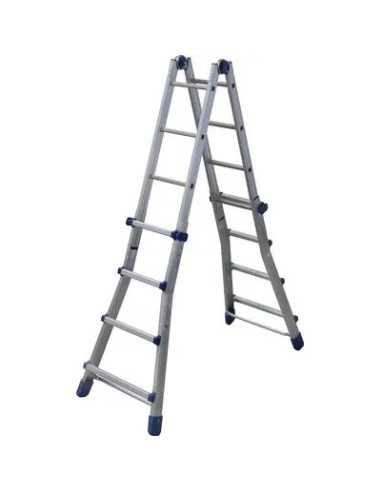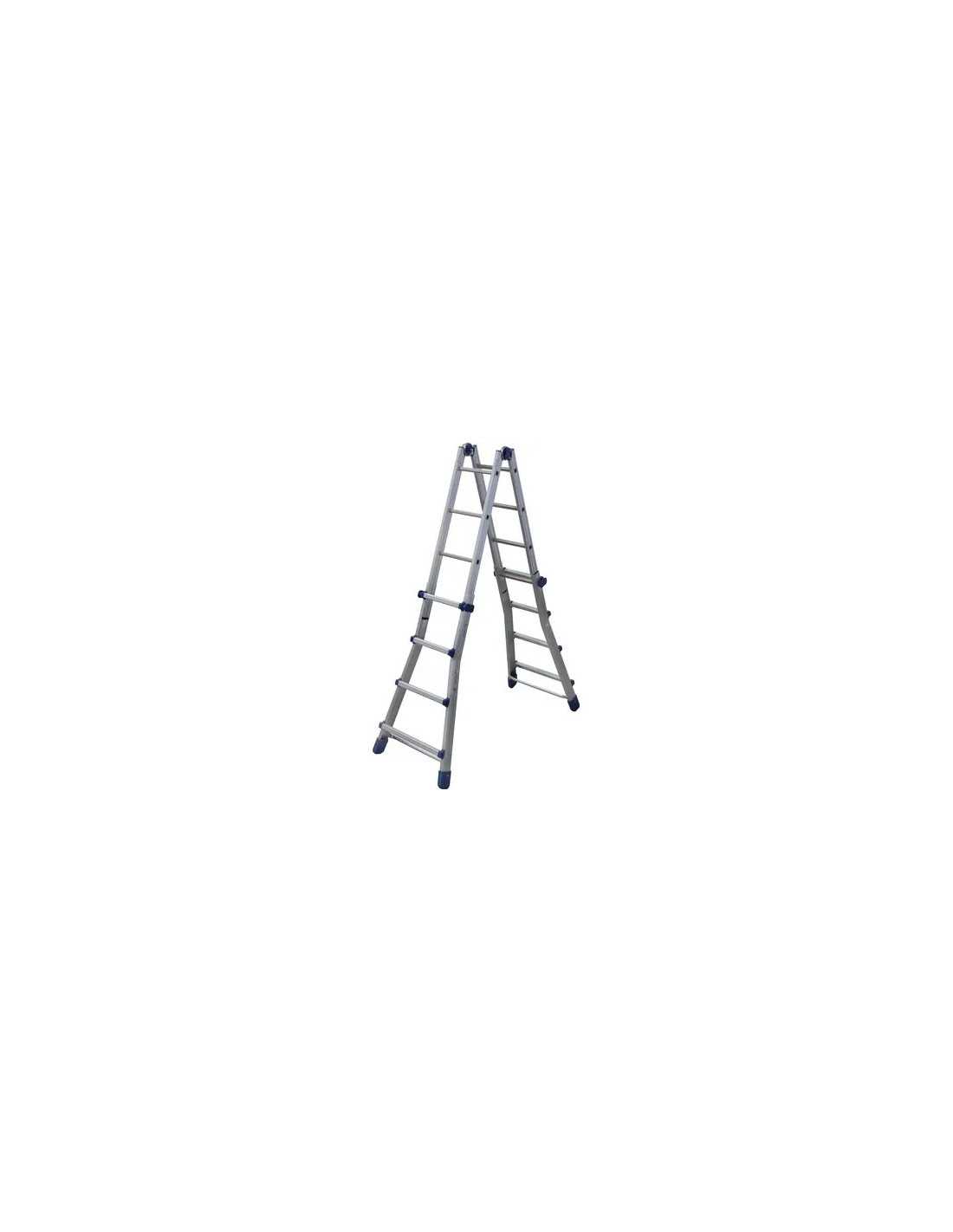 Scala telescopica in alluminio con base allargata per massima stabilità. Cerniere ricoperte da speciali malgame di resina per 2 possibili utilizzi: libera e bloccata. Portata di 150 Kg, conforme alle normative di sicurezza.