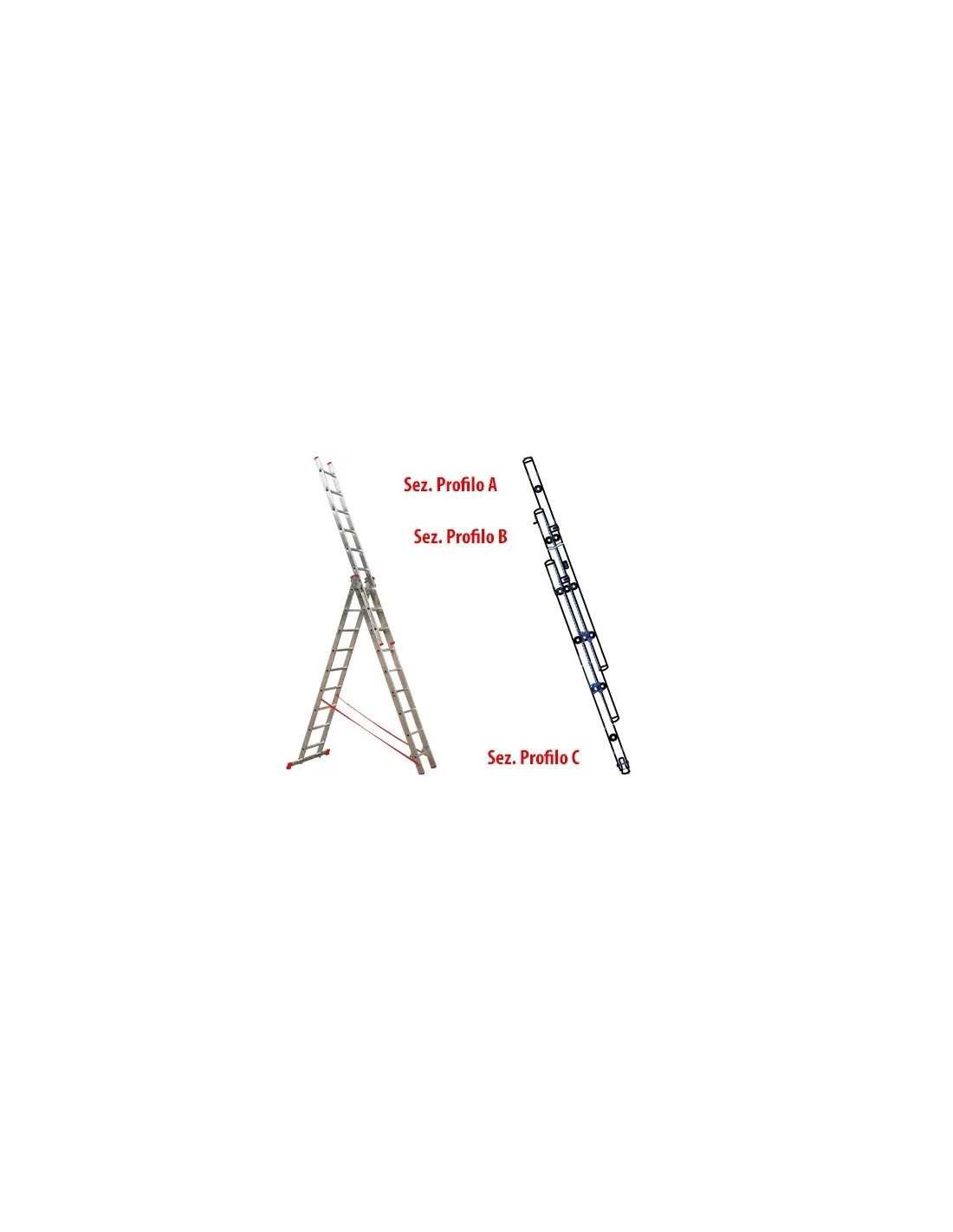 Scale alluminio triplici Brixo Step Up EN131 sono regolabili in altezza di gradino in gradino con sistema ad incastro e base stabilizzatrice inclusa. Con una portata massima di kg. 150, sono conformi alla normativa EN-131.