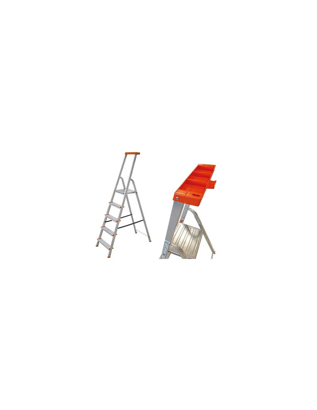 Il piano superiore è dotato di bloccaggio di sicurezza per evitare movimenti indesiderati durante l'utilizzo. Inoltre, la scala dispone di una comoda vaschetta portaoggetti e di un gancio portasecchio per avere sempre a portata di mano gli strumenti necessari. Con una portata massima di 150 Kg, questa scala è conforme alle normative EN 131.