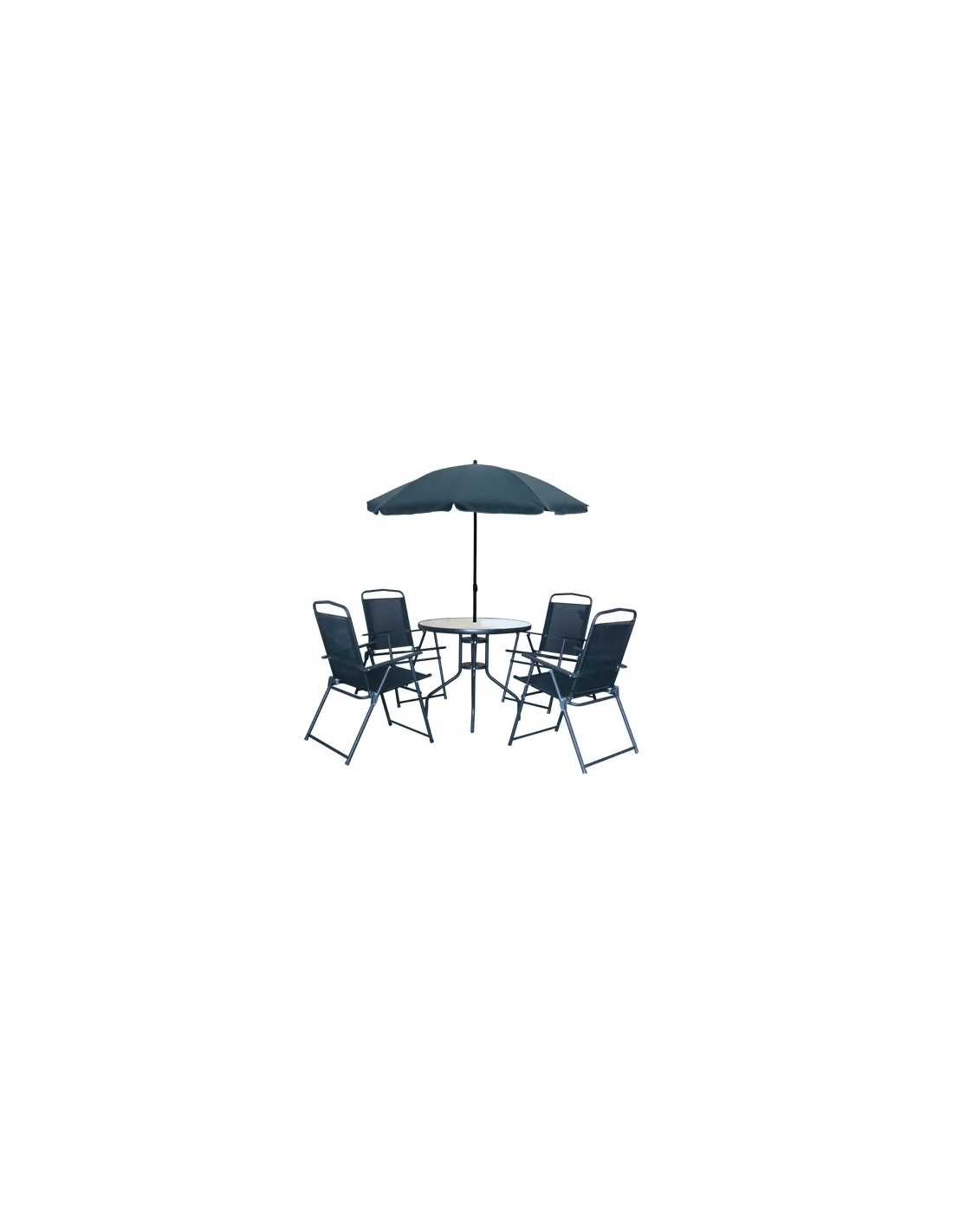 Set Funny è un elegante set composto da ombrellone, tavolo e 4 sedie, ideale per arredare il tuo spazio esterno con stile. La struttura in acciaio garantisce resistenza e durata nel tempo, mentre le sedie con seduta e schienale in textilene offrono comfort e praticità. Il tavolo con piano in vetro temperato aggiunge un tocco di eleganza, mentre l'ombrellone in poliestere nero completa l'insieme, garantendo ombra e protezione dal sole.