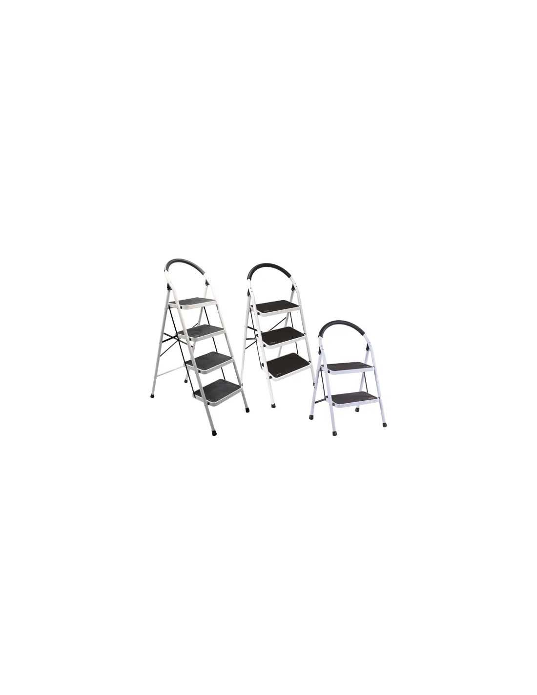 Sgabelli in acciaio verniciato bianco con ampi gradini gommati antiscivolo, ideali per garantire stabilità e sicurezza. Con una portata massima di 150 Kg, sono certificati GS TUV EAN 14183 per la massima qualità e resistenza.