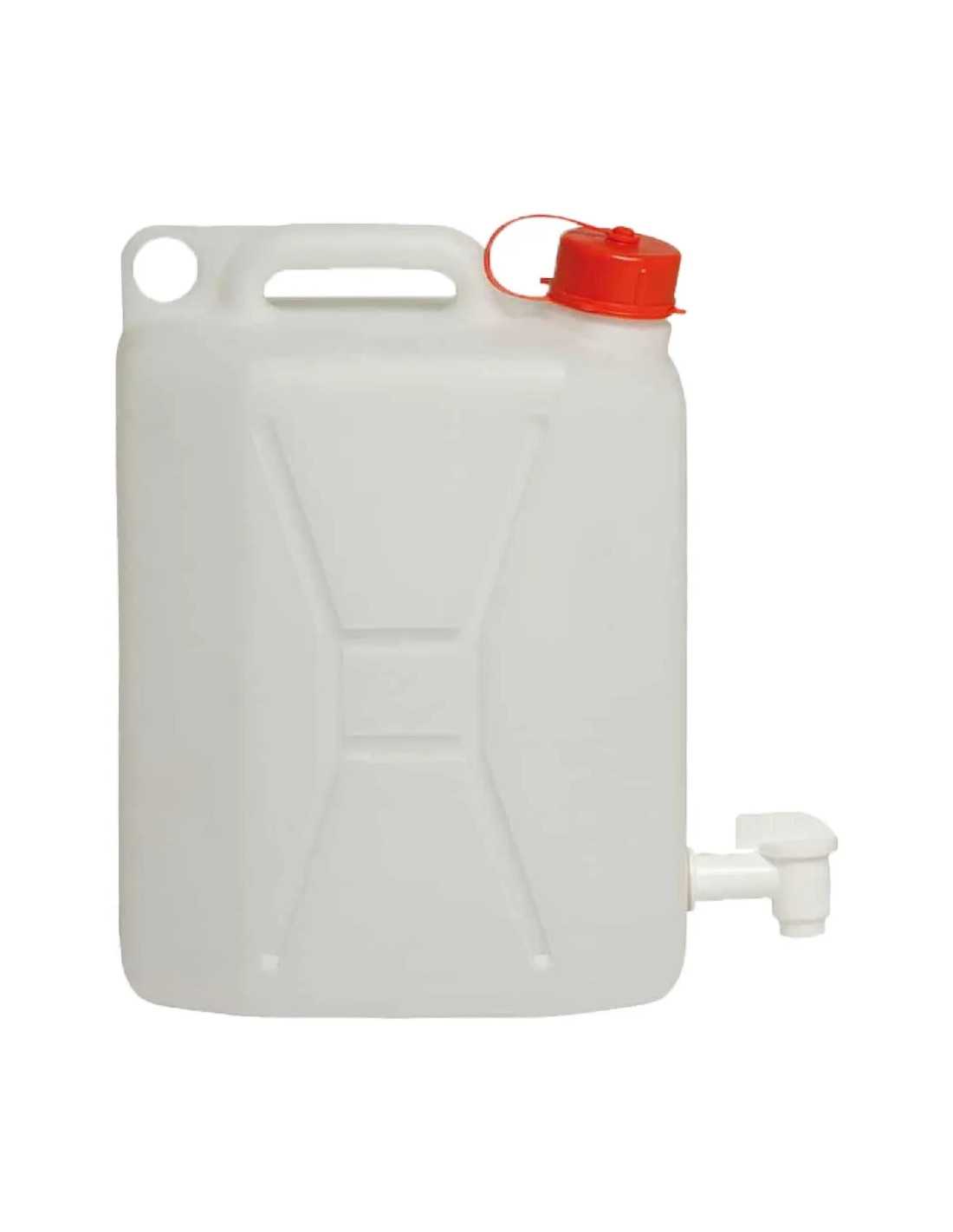 Tanica per alimenti adatta al contatto con sostanze alimentari, realizzata in polietilene alta densità con tappo e rubinetto in polipropilene. Completa di rubinetto da 1/4" e diametro foro di 45 mm.