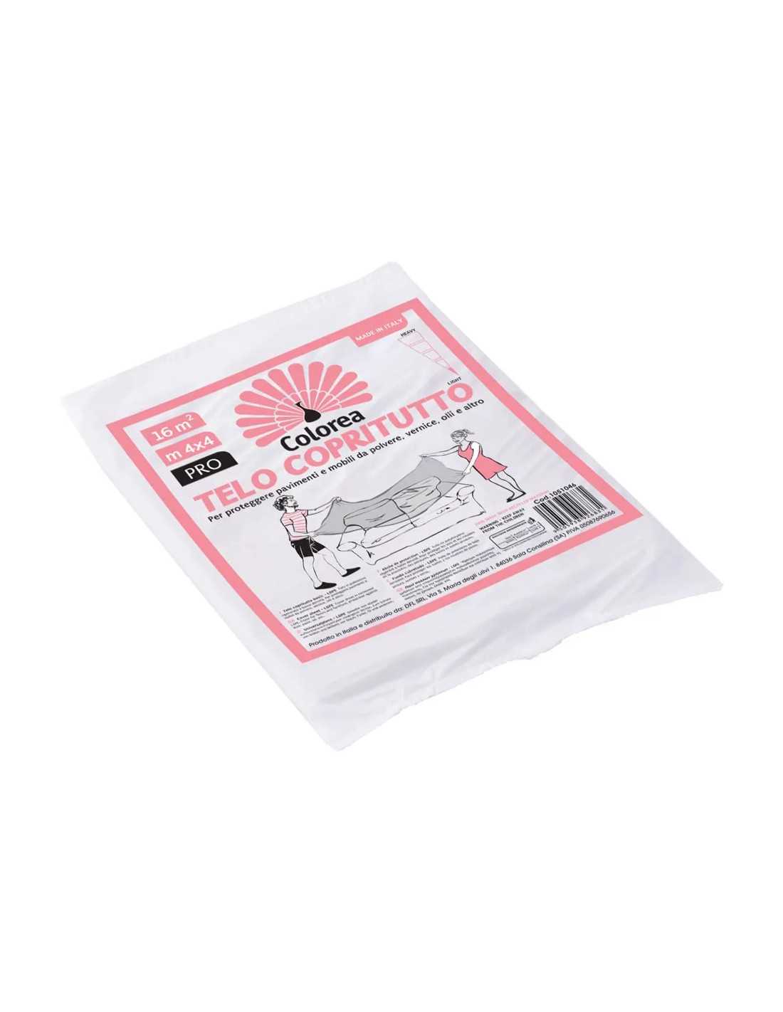 Il Telo Coprittutto Multiuso 'ECO' di COLOREA è l'accessorio perfetto per proteggere superfici ed oggetti durante lavori di tinteggiatura. Realizzato in polietilene neutro ad alta densità, questo telo è progettato per proteggere da schizzi, polveri e sporco in modo efficace e pratico.