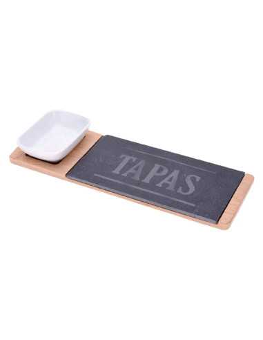 Vassoio in bimateriale con ciotola, ideale per servire snack, antipasti o diversi tipi di cibo. Realizzato in bambù ed ardesia, completo di ciotola in ceramica.