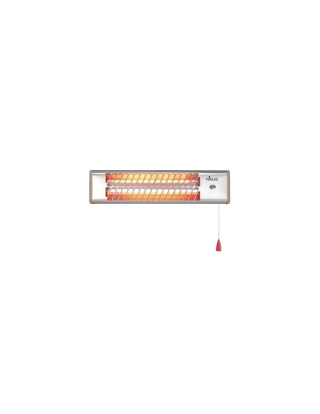 Stufa al quarzo da muro Niklas, ideale da applicare a parete, con potenza selezionabile da 600 a 1200 Watt e dimensioni compatte 54x13x12 cm.