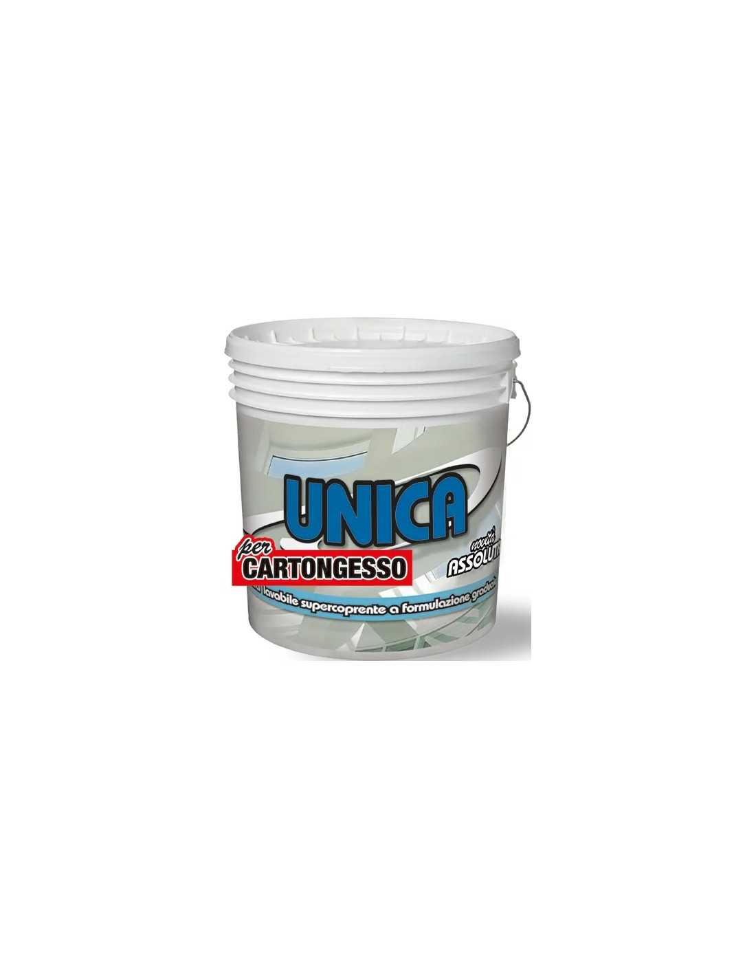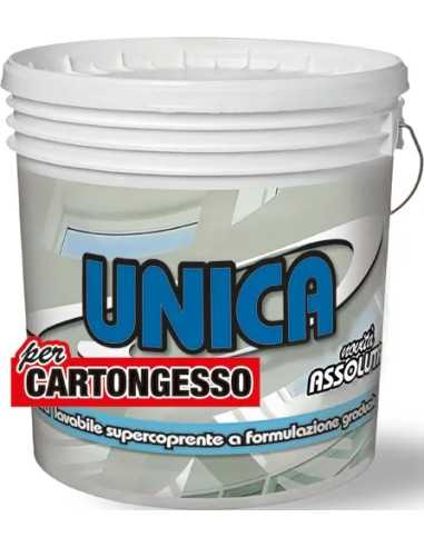 Idropittura UNICA CARTONGESSO è una vernice specifica per cartongesso, facile da applicare e con un eccellente potere coprente. Ideale per mascherare giunture e stuccature senza l'utilizzo di fissativo. Con un aspetto estremamente opaco e elevato potere riempitivo, può essere sufficiente anche una sola mano in alcuni casi. Resa di 8-10 mq./lt. per mano in funzione del supporto. Diluizione consigliata del 10-20% per la prima e la seconda mano.